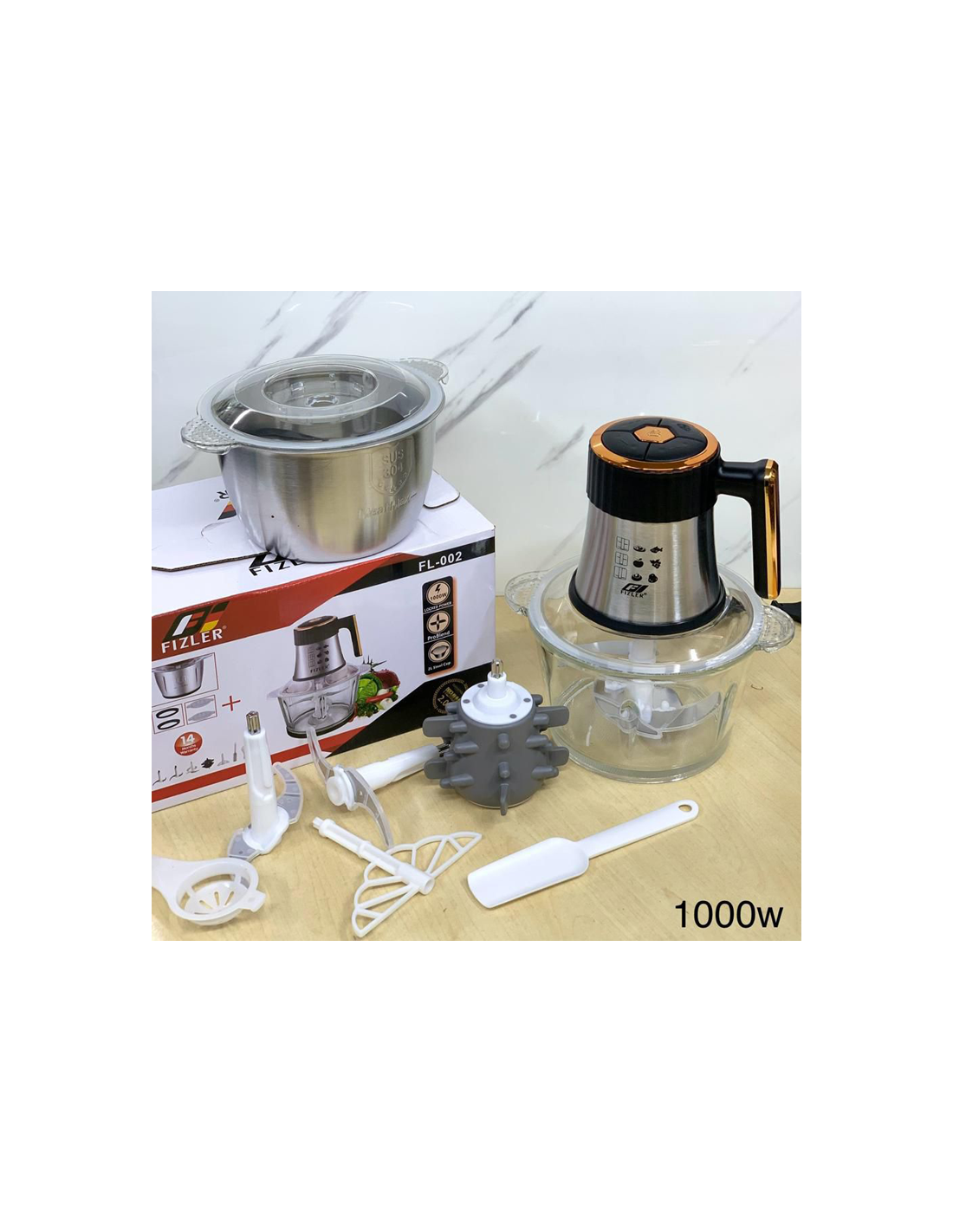 FIZLER Robot hachoir broyeur de viande et légume 2 bol 2L inox et verre 1000watt