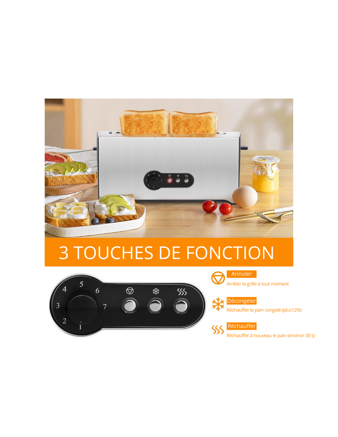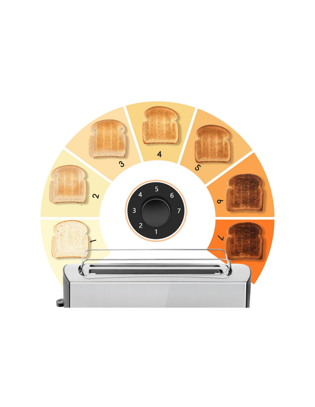 Ensuite, vous pouvez choisir parmi 7 niveaux de brunissage pour obtenir la couleur parfaite : du léger doré au toast croustillant. Le grille-pain longue fente intègre une fonction décongélation et une fonction réchauffage, pratiques pour les pains surgelés ou les viennoiseries. Enfin, le bouton arrêt rapide vous permet d’interrompre le cycle à tout moment.