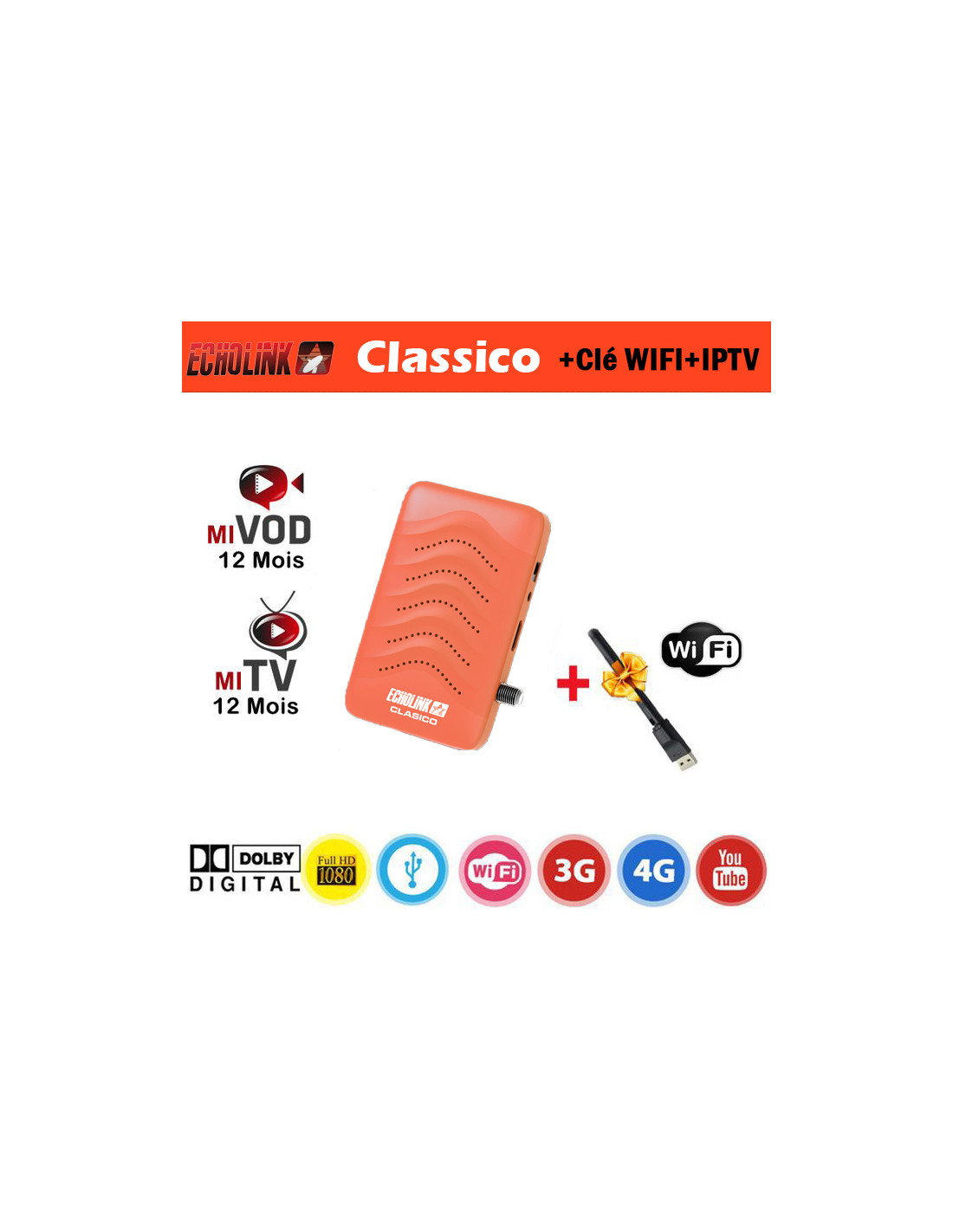 Echolink clasico recepteur numérique Avec abonnement IPTV 12 mois & Clé Wifi - Noir